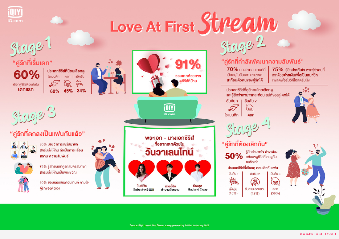 iQiyi (อ้ายฉีอี้) แพลตฟอร์มวิดีโอออนไลน์ชั้นนำได้เล็งเห็นความสำคัญของกลุ่มผู้ใช้บริการโดยให้ความสำคัญกับกลุ่มคู่รักช่วงวาเลนไทน์ในยุดโควิด-19 มาเป็นส่วนหนึ่งในการทำผลสำรวจเพื่อเป็นข้อมูลในการทำวิจัย สำหรับลำดับขั้นของความสัมพันธ์ และผลสำรวจสำหรับ “คู่รักที่เริ่มเดท (Stream & Match)” กันใหม่ๆ 60% เลือกที่จะใช้เวลาดูซีรีส์ด้วยกัน โดยนิยมดูซีรีส์แนวรักโรแมนติก มากเป็นอันดับ 1 ตามมาด้วย แนวตลกคอมเมดี้ และ แอ็คชั่นหรือผจญภัยรองลงมา ในขณะที่ “คู่รักที่กำลังพัฒนาความสัมพันธ์ (Continue watching) ” 70% มองว่าการเลือกคอนเทนต์ ที่จะมาดูด้วยกันของคู่รัก สามารถสะท้อนตัวตนของอีกคนได้ โดยคู่รักในช่วงระหว่างการพัฒนาความสัมพันธ์ มักเลือกนิยมดูซีรีส์แนวรักโรแมนติก มาเป็นอันดับ 1 รองลงมาเป็น แนวตลกคอมเมดี้ 75% รู้สึกประทับใจ หากรู้ว่าคนที่เดทด้วยจ่ายเงินเพื่อเป็นสมาชิกแพลตฟอร์มวิดีโอสตรีมมิ่ง “คู่รักที่ตกลงเป็นแฟนกันแล้ว (The Next Episode)” 80% มองว่าการแชร์บัญชีสมาชิกสตรีมมิ่งให้กัน ถือเป็นตัวบ่งบอกการเลื่อนสถานะความสัมพันธ์ที่แนบแน่นมากขึ้น และ คู่รัก 80% จะยอมเลือกชมคอนเทนต์ ตามใจคู่รักของตัวเอง 75% รู้สึกยินดีที่คู่รักซื้อและสมัครสมาชิกสตริมมิ่งให้กันเป็นของขวัญ ในขณะที่ “คู่รักที่ต้องเลิกกัน (Unsubscribe Your Relationship)” 50% มองว่า เป็นเรื่องทำใจลำบาก ถ้าจะต้องกลับมาดูซีรีส์หรือคอนเทนต์ที่เคยดูด้วยกันกับคนรักเก่า โดยคนส่วนใหญ่เลือกที่จะดูซีรีส์แนว แอ็คชั่น ผจญภัย ในช่วงอกหักมากเป็นอันดับ 1 ตามมาด้วยแนว สืบสวนสอบสวน และ ตลกคอมเมดี้