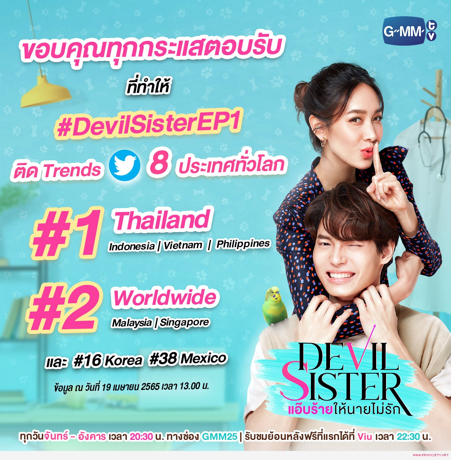 คอนเฟิร์มกันชัดๆ ไปเลยว่าปังแบบ 100% กับกระแสความแรงของซีรีส์แนวโรแมนติกฟีลกู๊ด “Devil Sister แอ๊บร้ายให้นายไม่รัก” จาก “GMMTV” บอกเล่าเรื่องราวความรักของผู้หญิงคนหนึ่งที่พยายามจะแอ๊บร้ายต่อหน้าคนอื่นเพื่อแก้ไขปมบางอย่าง แต่ถึงเธอจะร้ายยังไงก็ไม่อาจจะทำให้หนุ่ม ข้างบ้านหยุดคลั่งรักเธอได้เลย นำแสดงโดยคู่พระนางเคมีดี “วิน–เมธวิน โอภาสเอี่ยมขจร” และ “มิน–พีชญา วัฒนามนตรี” ซึ่งล่าสุดลงจอให้ชมกันเป็นตอนแรกก็สามารถโกยคะแนนความนิยมจากแฟนๆ ทั้งในและต่างประเทศไปแบบเกินต้าน พร้อมส่งให้ #DevilSisterEP1 พุ่งทะยานติดเทรนด์ทวิตเตอร์ 8 ประเทศทั่วโลก โดยขึ้นแท่น “อันดับ 1” ถึง 4 ประเทศ ไทย, อินโดนีเซีย, เวียดนาม, ฟิลิปปินส์ อีกทั้งยังติดเทรนด์ทวิตเตอร์ “อันดับ 2” ทั้ง Worldwide, สิงคโปร์, มาเลเซีย และติดเทรนด์ทวิตเตอร์ “อันดับ 16” ในประเทศเกาหลีใต้ รวมถึง “อันดับ 38” ในประเทศเม็กซิโกอีกด้วย ซึ่งฉากที่สร้างความฟินให้กับแฟนๆ ได้เบอร์แรงเลย คือฉากที่หมอน้ำชา (รับบทโดย วิน-เมธวิน) ออกอาการเขินจัดตอนพยายามจะจับมือพี่ไอริน (รับบทโดย มิน-พีชญา) ในโรงหนัง แถมยังเติมดีกรีความหวานละมุนตามแบบฉบับหนุ่มคลั่งรักในจังหวะที่จ้องหน้าพี่ไอรินอีกด้วย เรียกว่าความสนุกจัดหนักจัดเต็มโดนใจทุกซีนกันเลยทีเดียว รับรองว่าสัปดาห์หน้ามีโมเมนต์ความฟินมาเสิร์ฟให้ชมกันอีกเพียบ!!!