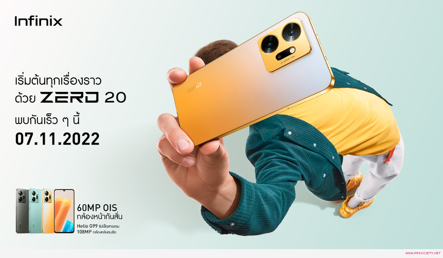 1 พฤศจิกายน 2565, กรุงเทพฯ – อินฟินิกซ์ (Infinix) เตรียมเปิดตัวสมาร์ตโฟนสายกล้องระดับพรีเมียมรุ่นใหม่ล่าสุด Infinix ZERO 20 กับสโลแกน “Capture Your Own Story from ZERO 20 – เริ่มต้นทุกเรื่องราวด้วย ZERO 20” ชูจุดขายเป็นสมาร์ตโฟนรุ่นแรกของโลกที่มีกล้องหน้าระบบกันสั่นแบบ OIS ความละเอียด 60 ล้านพิกเซล กล้องหลังคมชัด 108 ล้านพิกเซล เพื่อมอบประสบการณ์การใช้งานที่ล้ำกว่าและตอบโจทย์ผู้ใช้งานที่ชื่นชอบการถ่ายภาพด้วยกล้องมือถือ ในช่วงเรทราคาไม่เกิน 8,000 บาท พร้อมผสานพลังกับโปรเซสเซอร์ MediaTek Helio G99 ที่ให้หน่วยพื้นที่ความจำตัวเครื่องสูงถึง 256 GB และ Ram 8+5GB ถือเป็นผลงานการออกแบบที่ยกระดับทุกการใช้งานให้กับทุกคนได้อย่างลงตัว