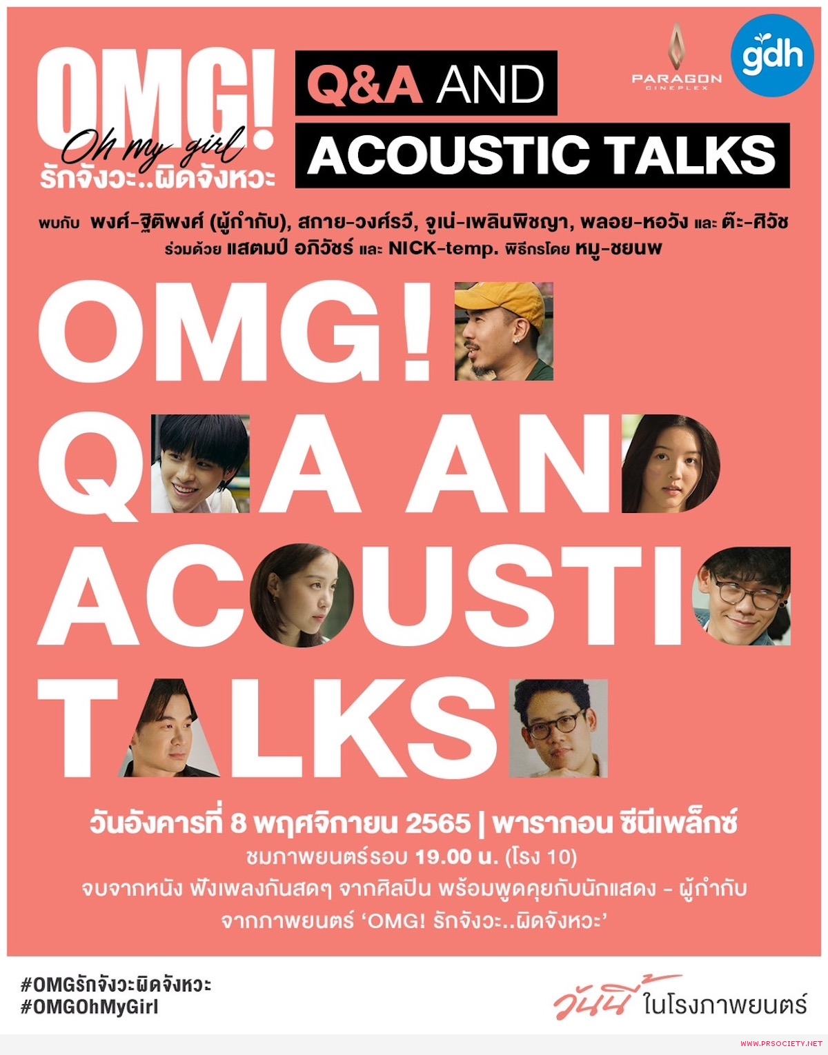 “GDH” จัดรอบพิเศษ “Q&A AND ACOUSTIC TALKS” มาดูหนังให้อิน พร้อมฟังเพลงให้ฟิน ไปกับหนัง “OMG! (Oh My Girl) รักจังวะ..ผิดจังหวะ” ร่วมชมภาพยนตร์และพูดคุยกับผู้กำกับพงศ์–ฐิติพงศ์ เกิดทองทวี และนักแสดง นำทีมโดย สกาย วงศ์รวี, จูเน่ เพลินพิชญา, พลอย หอวัง, ต๊ะ ศิวัช และฟังเพลงประกอบภาพยนตร์กันแบบสดๆ จากSTAMP, NICK-TEMP ดำเนินรายการโดย หมู–ชยนพ บุญประกอบ ในวันอังคารที่ 8 พ.ย. นี้ ที่พารากอน ซีนีเพล็กซ์ (โรง 10) รอบเวลา 19.00 น. กดจองตั๋วรอบพิเศษได้แล้ววันนี้ ที่แอปพลิเคชั่น และเว็บไซต์ http://www.majorcineplex.com/