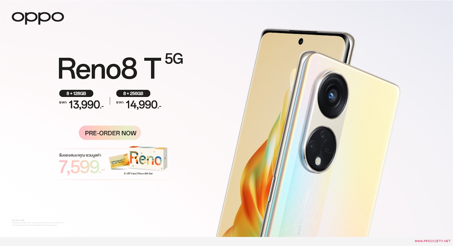สำหรับ OPPO Reno8 T 5G สมาร์ตโฟน The Portrait Expert ที่ถ่ายพอร์ตเทรตได้สวยที่สุด คมชัดกว่าที่เคย วางจำหน่ายใน 2 สีให้เลือก ได้แก่ สีใหม่สีทอง Sunrise Gold และสีดำ Midnight Black รุ่น 8 + 128GB วางจำหน่ายในราคา 13,990 บาท และรุ่น 8 + 256GB ราคา 14,990 บาท พิเศษสุด! สำหรับผู้ที่สั่งซื้อ OPPO Reno8 T 5G ล่วงหน้าระหว่างวันนี้ – 16 กุมภาพันธ์ 2566 รับฟรีทันทีของสมนาคุณรวมมูลค่าทั้งสิ้น 7,599 บาท ประกอบไปด้วย