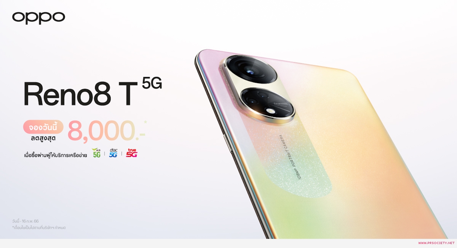 และเป็นเจ้าของ OPPO Reno8 T 5G ได้ง่ายขึ้นเมื่อซื้อกับผู้ให้บริการเครือข่ายในราคาลดสูงสุด 8,000 บาท โดย OPPO Reno8 T 5G โดย OPPO Reno8 T 5G จะวางจำหน่ายอย่างเป็นทางการพร้อมกันวันที 17 กุมภาพันธ์ 2566 สำหรับผู้ที่สนใจสามารถสัมผัสได้แล้ว ณ OPPO Brand Shop ทุกสาขา และตัวแทนจำหน่ายทั่วประเทศ