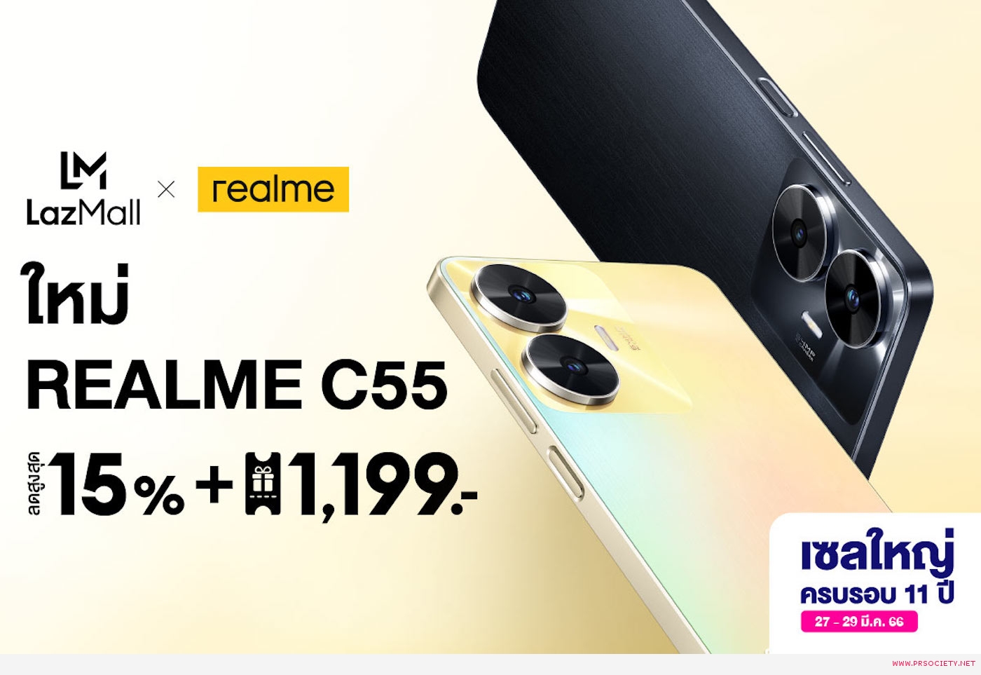 - พิเศษ! เรียลมี เปิดตัวสมาร์ตโฟนรุ่นใหม่ล่าสุด realme C55 ในราคาสุดปัง จำนวน 2 รุ่น เอ็กซ์คลูซีฟทางออนไลน์บนแอปฯ ลาซาด้าเท่านั้น โดย realme C55 รุ่นความจุ 6+128GB จะมาในราคาพิเศษเพียง 5,499 บาท และสำหรับนักช้อปที่สั่งซื้อ realme C55 รุ่นความจุ 8+256GB เป็น 200 ออเดอร์แรก รับไปเลยทันทีกระเป๋า Backpack สุดพิเศษ มูลค่า 1,199 บาท เฉพาะวันที่ 27 มีนาคม – 1 เมษายน เท่านั้น