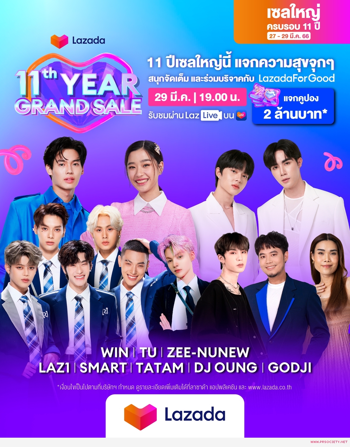 นอกจากแคมเปญ “เซลใหญ่ครบรอบ 11 ปี” ครั้งนี้จะมอบดีลและส่วนลดมากมายแล้ว ในโอกาสครบรอบ 11 ปี ลาซาด้ายังดึงแบรนด์แอมบาสเดอร์และเซเลบริตี้ขวัญใจวัยรุ่น นำโดย วิน-เมธวิน ร่วมด้วย ซี-พฤกษ์, นุนิว-ชวรินทร์, ตู-ต้นตะวัน, วง LAZ1 พร้อมด้วยตะแตมและสมาร์ท สองหนุ่มจากรายการ LAZ iCON มามอบความสุขและความอิ่มเอมใจให้กับแฟน ๆ ในไลฟ์สตรีมครั้งพิเศษ “Lazada 11th Year Grand Sale – Charity Live” ตลอด 1 ชั่วโมงครึ่ง กับกิจกรรมและบทเพลงสุดพิเศษ พร้อมแจกคูปองส่วนลดอีกมากมาย และยังเพื่อเปิดโอกาสให้แฟน ๆ ได้ร่วมบริจาคออนไลน์ผ่านโครงการ “LazadaForGood ให้ทุกใจได้ทำดี” ให้กับองค์กรการกุศล 11 แห่ง ได้แก่ มูลนิธิเทคโนโลยีสารสนเทศตามพระราชดำริสมเด็จพระเทพรัตนราชสุดา ฯ สยามบรมราชกุมารี, มูลนิธิคุ้มครองสัตว์ป่าและพรรณพืชแห่งประเทศไทยในพระบรมราชินูปถัมภ์,มูลนิธิช่วยคนตาบอดแห่งประเทศไทยในพระบรมราชินูปถัมภ์, สภากาชาดไทย, มูลนิธิขวัญชุมชน, มูลนิธิ ซี.ซี.เอฟ. เพื่อเด็กและเยาวชนฯ, มูลนิธิเพื่อสุนัขในซอย, มูลนิธิสถาบันราชพฤกษ์, มูลนิธิสันติสุข, สมาคมคนตาบอดแห่งประเทศไทย และสมาคมพิทักษ์สัตว์ (ไทย) เพื่อการดำเนินงานสนับสนุนสังคมและชุมชนในด้านต่าง ๆ โดยนักช้อปสามารถรับชมไลฟ์ และร่วมทำความดีไปด้วยกัน ในวันที่ 29 มีนาคมนี้ เวลา 19.00 น. เป็นต้นไป ผ่าน LazLive บนแอปฯ ลาซาด้า และ TikTok LazadaTH