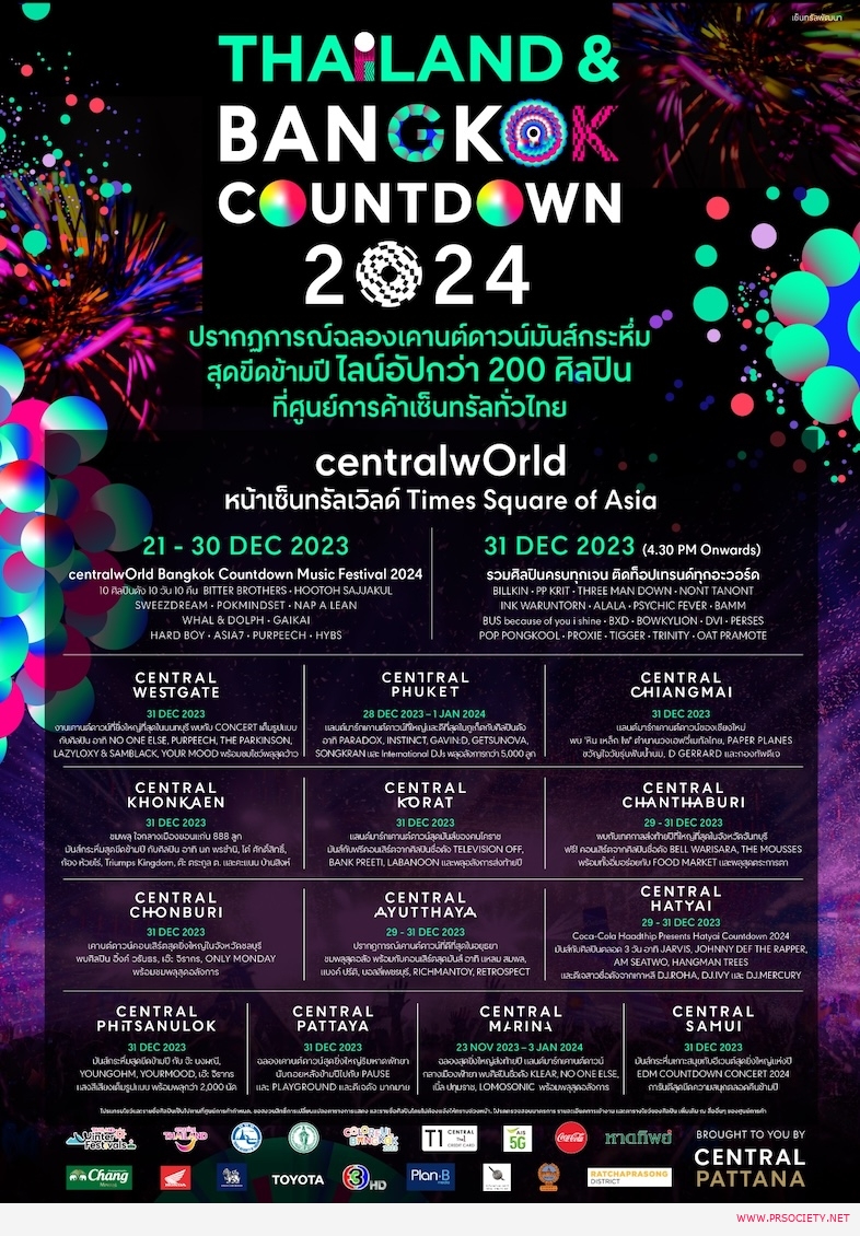 โดยเวทีเคานต์ดาวน์เซ็นทรัลเวิลด์ คือหนึ่งช่องทางที่คนทั่วโลกจะได้เห็นศักยภาพของศิลปินไทย ผ่านโชว์ และโปรดักชันที่ผ่านการคิดและออกแบบอย่างละเอียด ในคอนเซ็ปต์ Funtastic Future ตื่นตาไปกับเทคโนโลยี แสง สี เสียง เสมือนมิวสิกเฟสติวัลระดับโลก พร้อมปักหมุดฉลองเคานต์ดาวน์พร้อมกันทั่วประเทศในงาน Thailand Countdown 2024 ณ เคานต์ดาวน์แลนด์มาร์ก ศูนย์การค้าเซ็นทรัลอีก 13 สาขาทั่วประเทศ ได้แก่ เซ็นทรัล ภูเก็ต, สมุย, หาดใหญ่, เชียงใหม่, พิษณุโลก, อยุธยา, ขอนแก่น, โคราช, พัทยา, มารีนา, จันทบุรี, อยุธยา และเวสต์เกต รวมศิลปินทั่วประเทศมากกว่า 200 ชีวิต