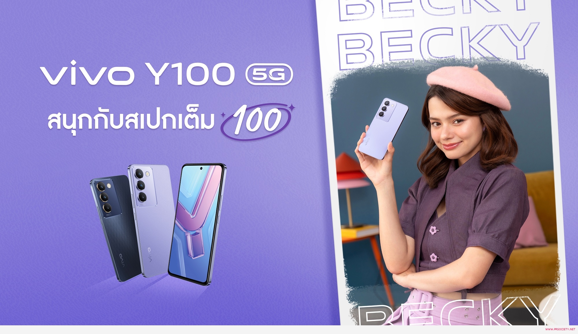 เป็นครั้งแรกของการร่วมงานระหว่าง vivo และสาวเบคกี้ โดยงานนี้ทั้งคู่เตรียมเอาใจผู้ใช้งานสมาร์ตโฟนสายจัดเต็มสเปกรอบด้านด้วยการส่ง vivo Y100 5G น้องเล็กราคาจับต้องได้ สู่ตลาดประเทศไทย มาพร้อมความจุ ROM เต็มอิ่มถึง 256GB ควบคู่กับ RAM 8GB เพื่อการใช้งานที่ลื่นไหลไม่สะดุด เพลิดเพลินกับการเล่นเกมและรับชมทุกคอนเทนต์ด้วยจอแสดงผล Ultra Vision AMOLED แบบเจาะรู ขนาด 6.67 นิ้ว ความละเอียด 120Hz และระบบเสียงแบบลำโพงสเตอริโอคู่ ไร้กังวลเรื่องการใช้งานตลอดวันด้วยแบตเตอรี่ที่ขนาดใหญ่ถึง 5000mAh และระบบชาร์จไว 80W