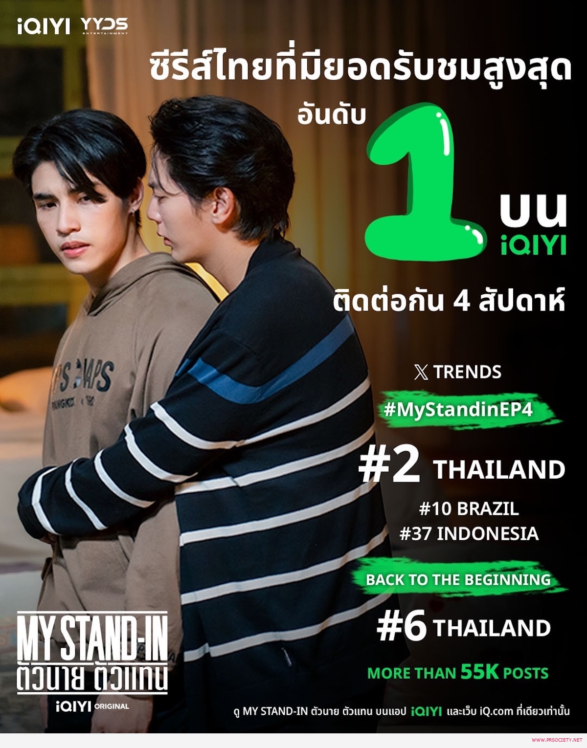 งานนี้ ทั้ง iQIYI (อ้ายฉีอี้) ผู้อำนวยการสร้าง iQIYI Original ไทยเรื่องแรก และทีม YYDS Entertainment ผู้ผลิตซีรีส์ รวมไปถึงนักแสดง เรื่อง ‘MY STAND-IN ตัวนาย ตัวแทน’ ต่างแฮปปี้ยิ้มแก้มปริ เมื่อ MY STAND-IN ตัวนาย ตัวแทน กระแสแรงอย่างต่อเนื่อง ขึ้นเป็นซีรีส์ไทยที่มียอดรับชมสูงสุด อันดับ 1 บนแอป #iQIYI ติดต่อกันถึง 4 สัปดาห์ และทำให้ Keyword : BACK TO THE BEGINNING ติดเทรนด์เป็นอันดับ 6 อีกด้วย!
