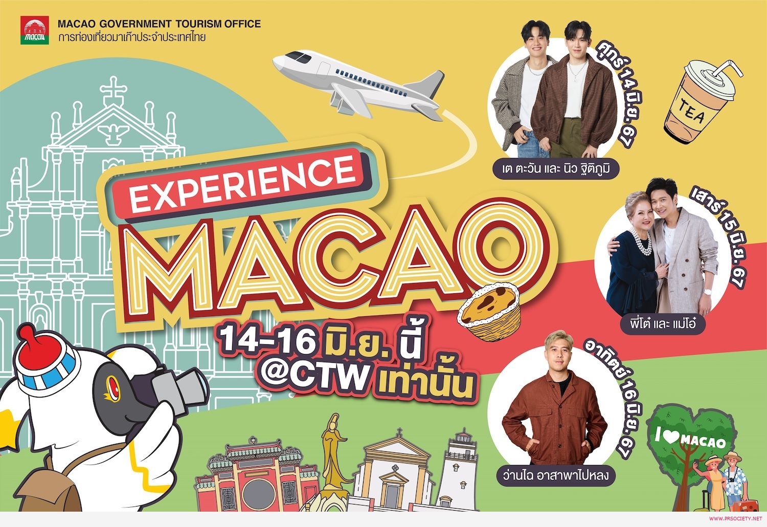 กลับมาอีกครั้งกับอีเวนต์ใหญ่ประจำปีของการท่องเที่ยวมาเก๊าประจำประเทศไทย กับงาน “Experience Macao มามะ มาเก๊า” ที่ปีนี้จัดใหญ่กว่าเดิม พร้อมพบกับคู่จิ้นคู่ฮอต “เต-ตะวัน วิหครัตน์” และ “นิว-ฐิติภูมิ เตชะอภัยคุณ” ที่ทั้งคู่เตรียมขนความสนุกและสร้างรอยยิ้มให้เหล่าด้อมโพก้า กับการแสดงโชว์ร้อง เล่น เต้น ไปกับน้อง Mak Mak มาสคอตประจำของการท่องเที่ยวมาเก๊า พร้อมร่วมเล่นเกมและกิจกรรมสนุก ๆ มากมาย และภายในงานยังมีโปรโมชันแพคเกจท่องเที่ยวสุดคุ้ม ทั้งตั๋วเครื่องบินราคาพิเศษ และโปรบิน 1 แถม 1 โปรโมชันห้องพักระดับ 5 ดาว จาก 6 กลุ่มโรงแรมของมาเก๊าในราคาสุดพิเศษ และแพคเกจท่องเที่ยว Greater Bay Area ตลอดจนกิจกรรมและข้อเสนอพิเศษจากพันธมิตรมากมาย พบกันที่งาน “Experience Macao มามะ มาเก๊า” ในวันศุกร์ที่ 14 มิถุนายน 2567 เวลา 14.00 น. เป็นต้นไป ณ บริเวณลาน Central Court ชั้น 1 ศูนย์การค้าเซ็นทรัลเวิลด์
