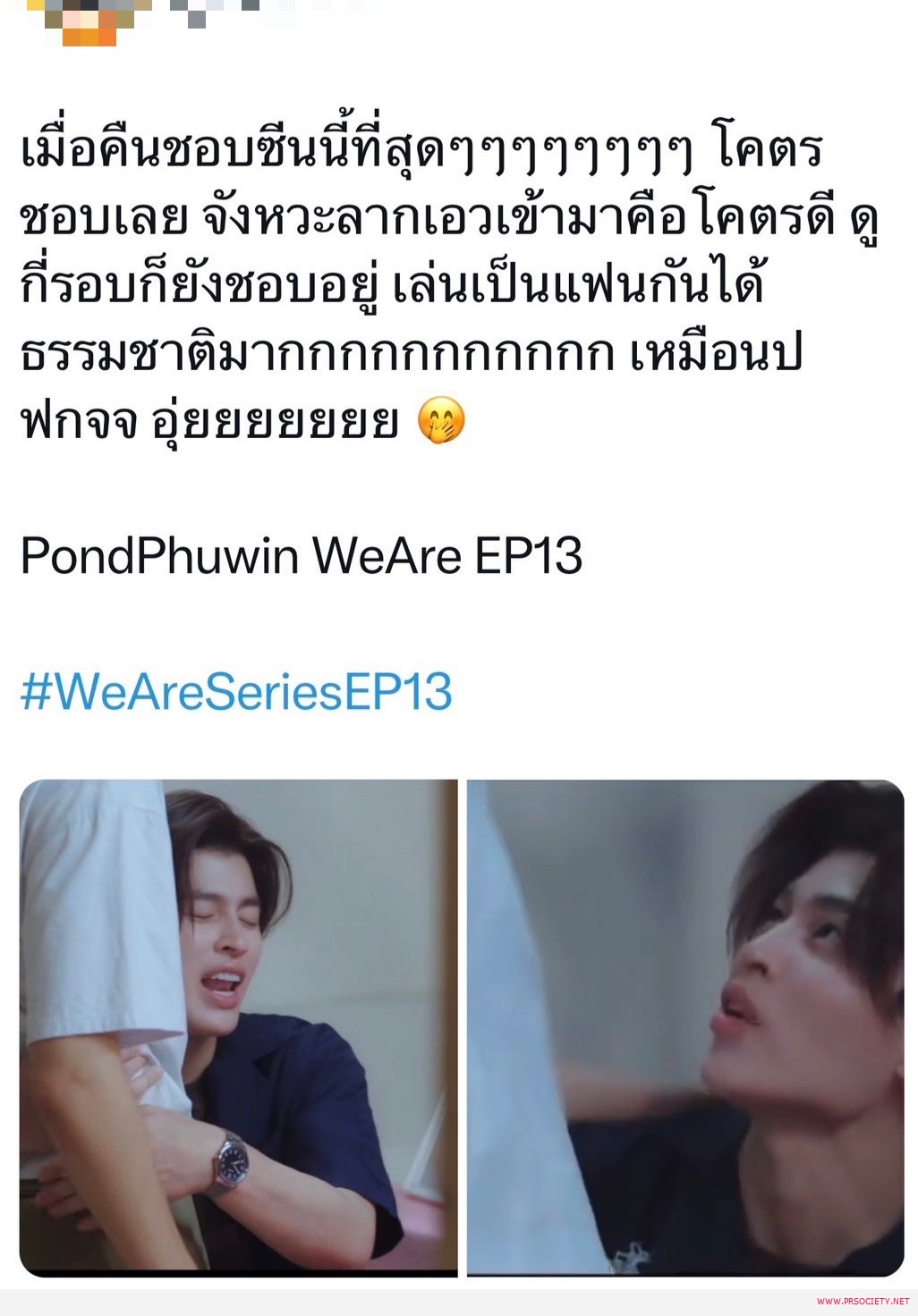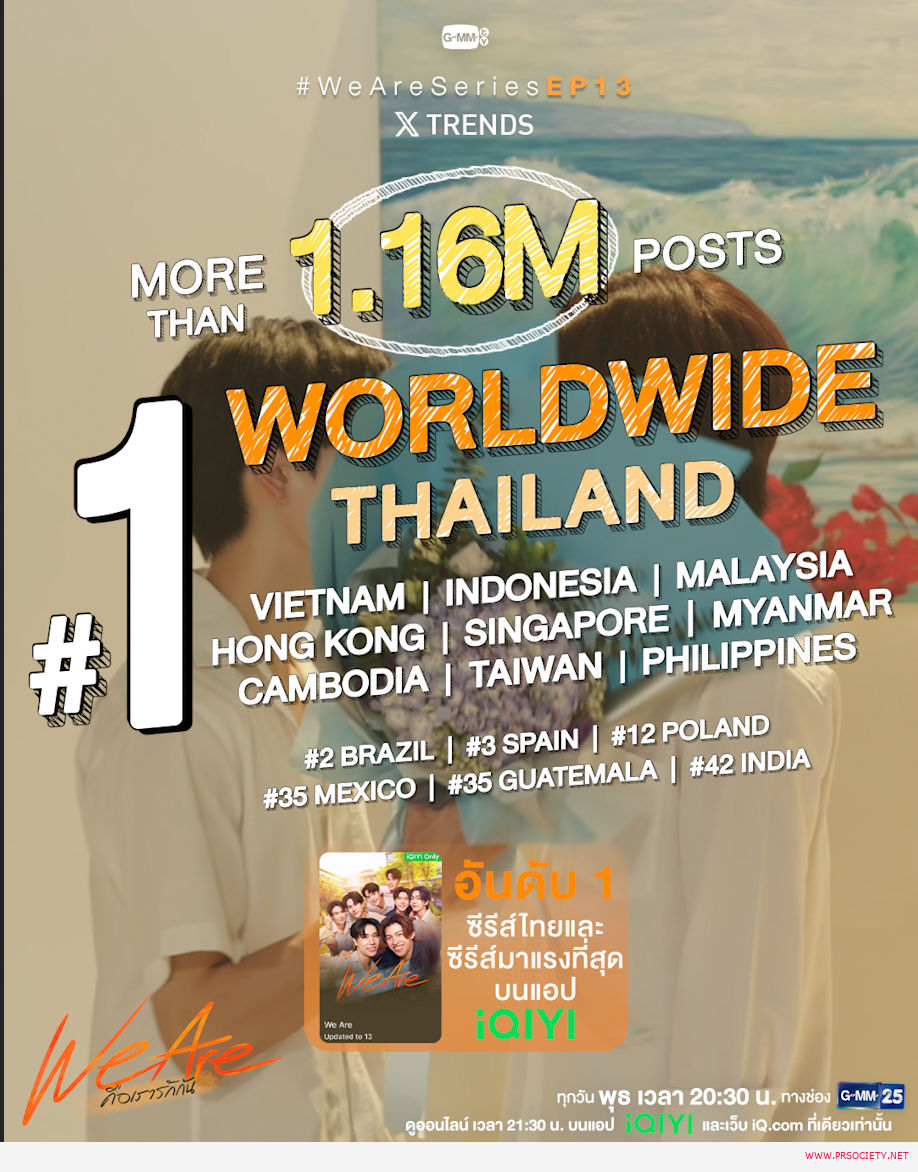 ปังไม่หยุด!! สำหรับซีรีส์วัยรุ่นคุณภาพ “We Are คือเรารักกัน” จาก “GMMTV” คอนเทนต์โพรไวเดอร์ชั้นนำของเมืองไทย ที่ล่าสุดเล่นถึงมาก ทำเอาแฟนๆ ฟินเบอร์แรง พร้อมใจกันแห่คอมเมนต์สนั่นโซเชียลทั่วโลกในทุกๆ แพลตฟอร์ม กับ EP.ล่าสุด #WeAreSeriesEP13 ถึงทีมนักแสดงสุดฮอต “ปอนด์-ณราวิชญ์ เลิศรัตน์โกสุมภ์, ภูวินทร์ ตั้งศักดิ์ยืน, วินนี่-ธนวินท์ ผลเจริญรัตน์, สตางค์-กิตติภพ เสรีวิชยสวัสดิ์, อู๋-ธนบูรณ์ เกียรตินิรันดร์, บูม-ธราธร จันทรวรกาญจน์, มาร์ค-ณฐริศร์ วรกรเลิศสิทธิ์, ปูน มิตรภักดี” และทีมนักแสดงคุณภาพอย่าง “ไซซี-รัตท์ริชา ประภากิติ, เจเจ-ชยกร จุฑามาศ, ธี-ธีรเดช วิถีพานิชย์, ไตเติ้ล-กีรติ พวงมาลี, เปปเปอร์-ภานุโรจน์ เฉลิมกิจพรทวี, อาร์ม-วีรยุทธ จันทร์สุข, ก๊อตจิ-ทัชชกร บุญลัภยานันท์, นะ-ธนบูลย์ วัลลภศิรินันท์, แชมป์-ณัฐรัชต์ ก้อนแก้ว ฯลฯ” ส่งให้แฮชแท็ก #WeAreSeriesEP13 สร้างปรากฎการณ์ขึ้นแท่นเทรนด์ X “อันดับ 1” Worldwide 8 สัปดาห์ต่อเนื่อง และยังติดเทรนด์ x “อันดับ 1” อีก 10 พื้นที่ทั่วโลก ได้แก่ Thailand, Vietnam, Indonesia, Malaysia, Hong Kong, Singapore, Myanmar, Cambodia, Taiwan, Philippines และมียอดโพสต์สูงกว่า 1.16M โพสต์ เรียกว่าเป็นซีรีส์วัยรุ่นที่ได้เสียงตอบรับเป็นอย่างดี ชนิดแรงดีไม่มีแผ่ว เพราะทำสถิตินั่งแท่นแชมป์เทรนด์ X “อันดับ 1” Worldwide ติดต่อนานถึง 8 EP. ตั้งแต่ EP.6-EP.13 รวมทั้งยังขึ้นแท่นเป็นซีรีส์ไทยและซีรีส์มาแรงที่สุด “อันดับ 1” บนแอป iQIYI อีกด้วย