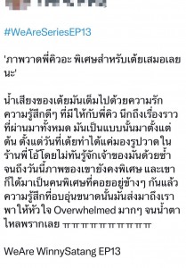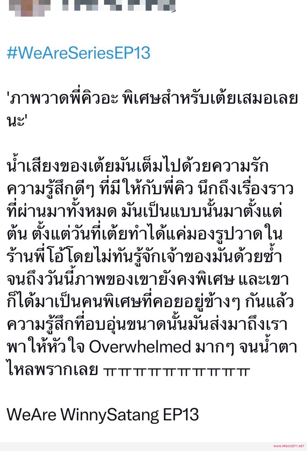 -‘ภาพวาดพี่คิวอะ พิเศษสำหรับเต้ยเสมอเลยนะ’ น้ำเสียงของเต้ยมันเต็มไปด้วยความรัก ความรู้สึกดีๆ ที่มีให้กับพี่คิว นึกถึงเรื่องราวที่ผ่านมาทั้งหมด มันเป็นแบบนั้นมาตั้งแต่ต้น ตั้งแต่วันที่เต้ยทำได้แค่มองรูปวาดในร้านพี่โอ้โดยไม่ทันรู้จักเจ้าของมันด้วยซ้ำ จนถึงวันนี้ภาพของเขายังคงพิเศษ และเขาก็ได้มาเป็นคนพิเศษที่คอยอยู่ข้างๆ กันแล้ว ความรู้สึกที่อบอุ่นขนาดนั้นมันส่งมาถึงเราพาให้หัวใจ Overwhelmed มากๆ จนน้ำตาไหลพรากเลย TT TT TT TT TT TT #WeAreSeriesEP13