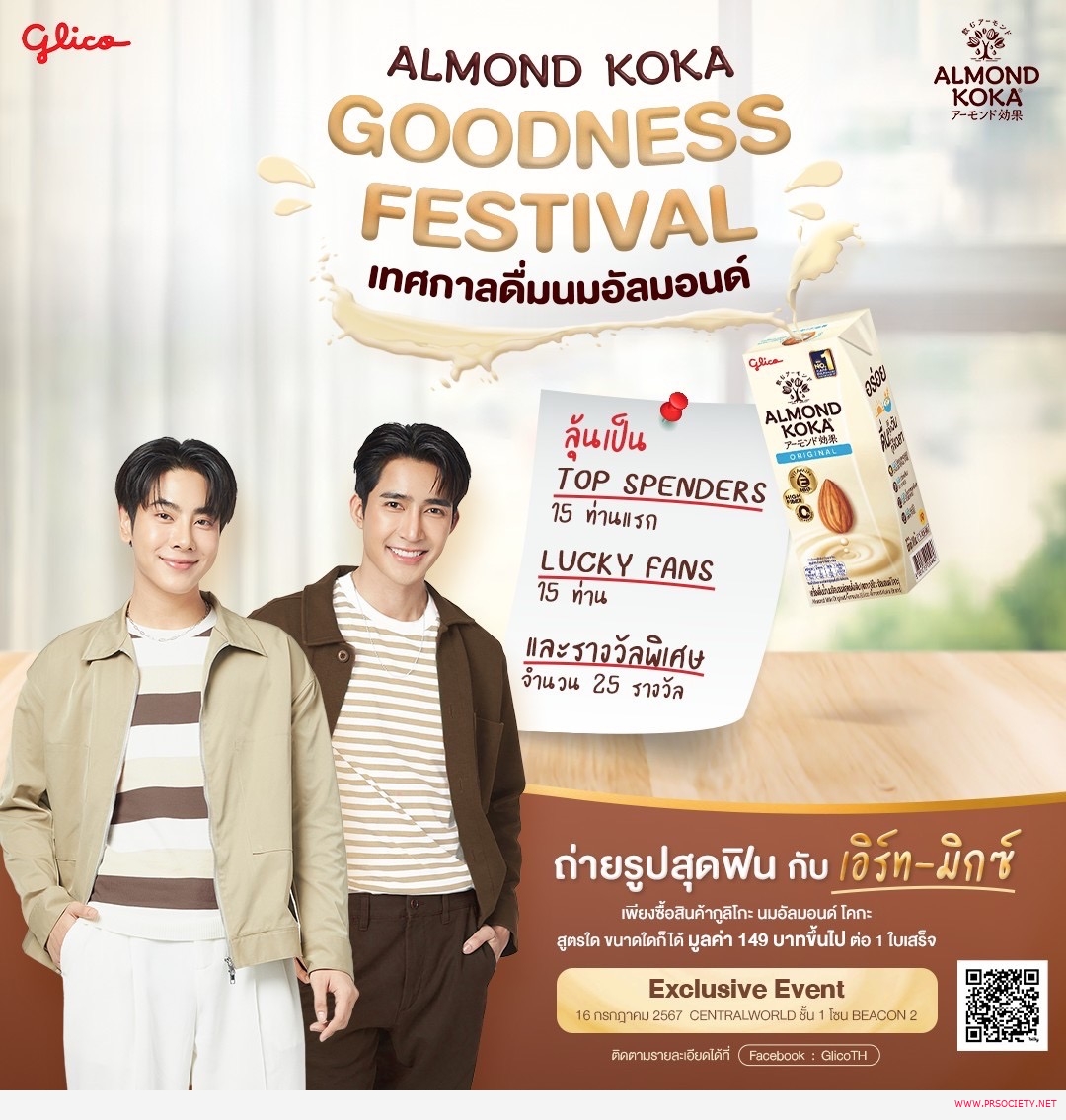 กูลิโกะ อัลมอนด์ โคกะ ผลิตภัณฑ์นมอัลมอนด์ยอดขายอันดับ 1 จากประเทศญี่ปุ่น โดย บริษัท ไทยกูลิโกะ จำกัด หลังได้เปิดตัวในประเทศไทยในปีที่ผ่านมา ได้รับเสียงตอบรับที่ดีและครองใจผู้บริโภคมาตลอดจนถึงวันนี้ เพื่อเป็นการส่งต่อสุขภาพดีอย่างต่อเนื่อง กูลิโกะ อัลมอนด์ โคกะ จึงได้จัดกิจกรรมดีๆ สร้างการรับรู้ถึงประโยชน์จากนมอัลมอนด์ โคกะ ภายใต้ชื่องาน Glico Almond Koka Goodness Festival เทศกาลดื่มนมอัลมอนด์ ซึ่งภายในงานจะได้พบกับ 2 หนุ่มคู่จิ้นสุดฮอต “เอิร์ท” พิรพัฒน์ วัฒนเศรษสิริ และ “มิกซ์” สหภาพ วงศ์ราษฎร์ ที่จะมาแชร์เคล็ดลับ การมีสุขภาพที่ดี คุณประโยชน์จากนมอัลมอนด์ โคกะ พร้อมด้วยเมนูสุดพิเศษ และทั้ง 2 หนุ่มยังเตรียมโชว์ร้องเพลงให้ทุกคนได้ฟังกันอีกด้วย โดยในงานนี้อัดแน่นไปด้วยกิจกรรมมากมายตลอดทั้งวัน เรียกได้ว่าอร่อยสุขภาพดีบิ๊วตี้ครบจบในกล่องเดียว ห้ามพลาดพบกัน วันอังคาร ที่ 16 กรกฎาคม 2567 เวลา 17.00-20.00 น. ณ โซน Beacon 2 ชั้น 1 ศูนย์การค้าเซ็นทรัลเวิลด์