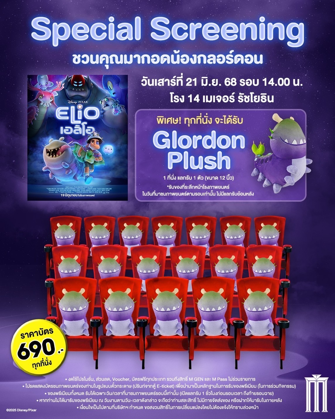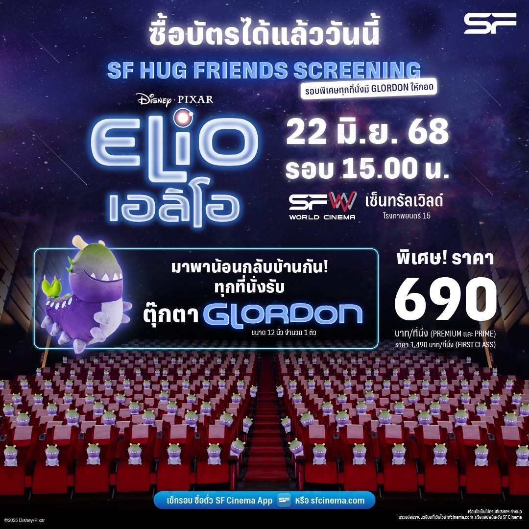 พลาดไม่ได้กับรอบพิเศษ ชวนกอดน้องกลอร์ดอนดู “Disney and Pixar’s Elio เอลิโอ” ในวันเสาร์ที่ 21 มิถุนายน 2568 รอบ 14.00 น. ที่โรงภาพยนตร์เมเจอร์ รัชโยธิน และวันอาทิตย์ที่ 22 มิถุนายน 2568 รอบ 15.00 น. ที่โรงภาพยนตร์ SF World Cinema เซ็นทรัลเวิลด์ โดยทุกที่นั่งจะได้รับตุ๊กตากลอร์ดอนขนาด 12 นิ้วกลับบ้าน ที่นั่งละ 1 ตัว ในราคาบัตร 690 บาทต่อที่นั่ง