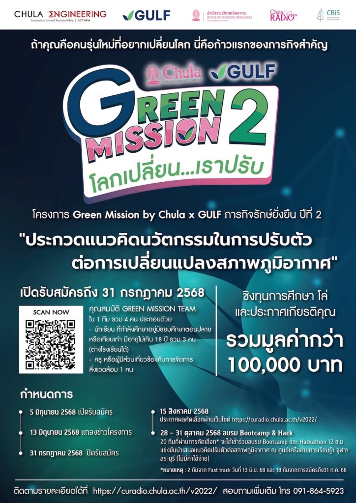 พร้อมกลับมาเปิดพื้นที่ให้เหล่านักคิดคนเก่งได้ออกไอเดียนำเสนอนวัตกรรมสุดสร้างสรรค์อย่างต่อเนื่อง กับโครงการ Green Mission by Chula x GULF ภารกิจรักษ์ยั่งยืน ปีที่ 2 ภายใต้หัวข้อ “Climate change adaptation : โลกเปลี่ยน เราปรับ” ซึ่งเป็นกิจกรรมดีๆ ที่ทางบริษัท กัลฟ์ ดีเวลลอปเมนท์ จำกัด (มหาชน) (กัลฟ์) ร่วมมือกับ คณะวิศวกรรมศาสตร์ จุฬาลงกรณ์มหาวิทยาลัย จัดขึ้นเพื่อเชิญชวนนักเรียนระดับมัธยมปลายมาร่วมระดมพลังความคิดสร้างสรรค์ออกไอเดียคิดค้นนวัตกรรมจัดการปัญหาด้านสิ่งแวดล้อมสู่การพัฒนาอย่างยั่งยืน พร้อมกับตระหนักถึงการเปลี่ยนแปลงของสภาพภูมิอากาศที่เกิดขึ้นอย่างรวดเร็ว โดยภายในงานแถลงข่าวเปิดตัวโครงการได้มีน้องๆ ผู้สนใจเข้าร่วมงานอย่างคับคั่งเมื่อวันที่ 13 มิถุนายน 2568 ที่ผ่านมา ณ หอประชุมคณะวิศวกรรมศาสตร์ จุฬาลงกรณ์มหาวิทยาลัย