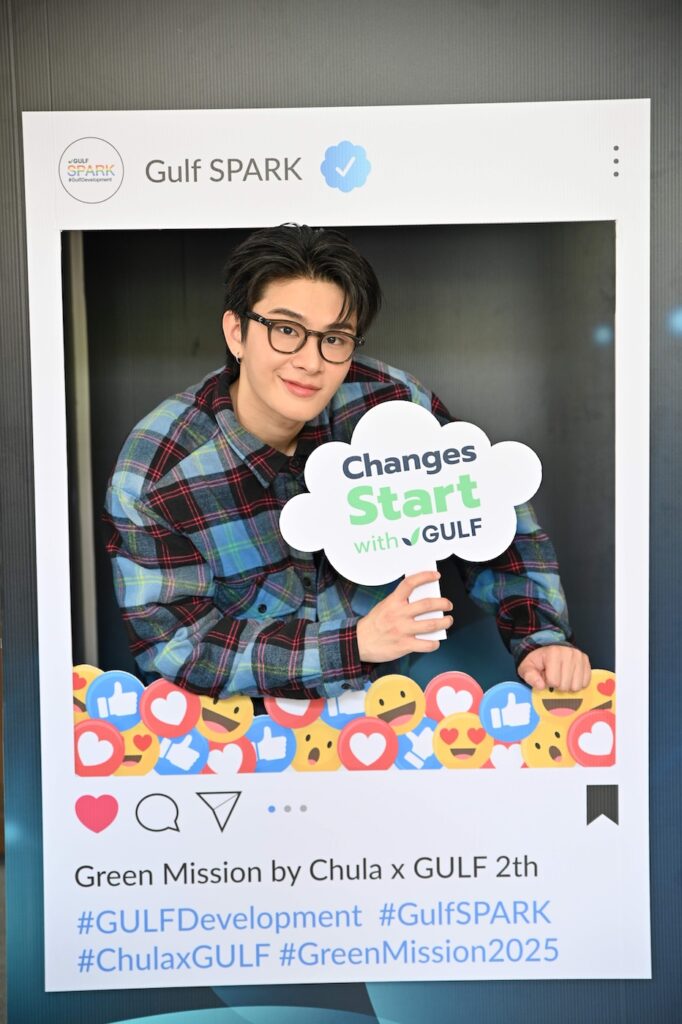 “ไทย-ชญานนท์” กล่าวว่า “ผมรู้สึกตื่นเต้นมากครับที่ได้มาร่วมงานแถลงข่าวเปิดตัวโครงการ Green Mission by Chula x GULF ภารกิจรักษ์ยั่งยืน ปีที่ 2 ซึ่งผมก็เรียนวิศวะเหมือนกัน เลยรู้สึกเป็นเกียรติมากที่ได้มาสร้างแรงบันดาลใจให้กับน้องๆ ในการคิดและสร้างสรรค์นวัตกรรมรักษ์โลก ก็ต้องขอบคุณทาง GULF และ จุฬาฯ ที่ชวนผมมางานในวันนี้ ซึ่งปัจจุบันสภาพแวดล้อมถูกทำลายและเปลี่ยนแปลงไปอย่างรวดเร็ว เพราะฉะนั้นสิ่งสำคัญที่พวกเราควรจะต้องตระหนักถึงนั้นคือการ Go green โดยหลักการง่ายๆ นั้นคือเริ่มต้นที่ตัวเราอย่างเช่น การแยกขยะ ใช้น้ำอย่างประหยัด ซึ่งผมมองว่ามันเป็นเรื่องง่ายๆ แค่เราต้องใส่ใจมัน อย่ามองว่าเป็นเรื่องเล็ก เพราะเรื่องเล็กๆ หลายๆ เรื่องรวมกันก็กลายเป็นปัญหาสิ่งแวดล้อมที่ส่งผลกระทบในระยะยาวได้ สุดท้ายผมอยากจะบอกว่าผมดีใจที่ได้เห็นพลังคนรุ่นใหม่ที่มาร่วมกันระดมความคิดไอเดียสุดเจ๋งเพื่อโลกของเรา เพราะทุกคนคือพลังของวันพรุ่งนี้ครับ”