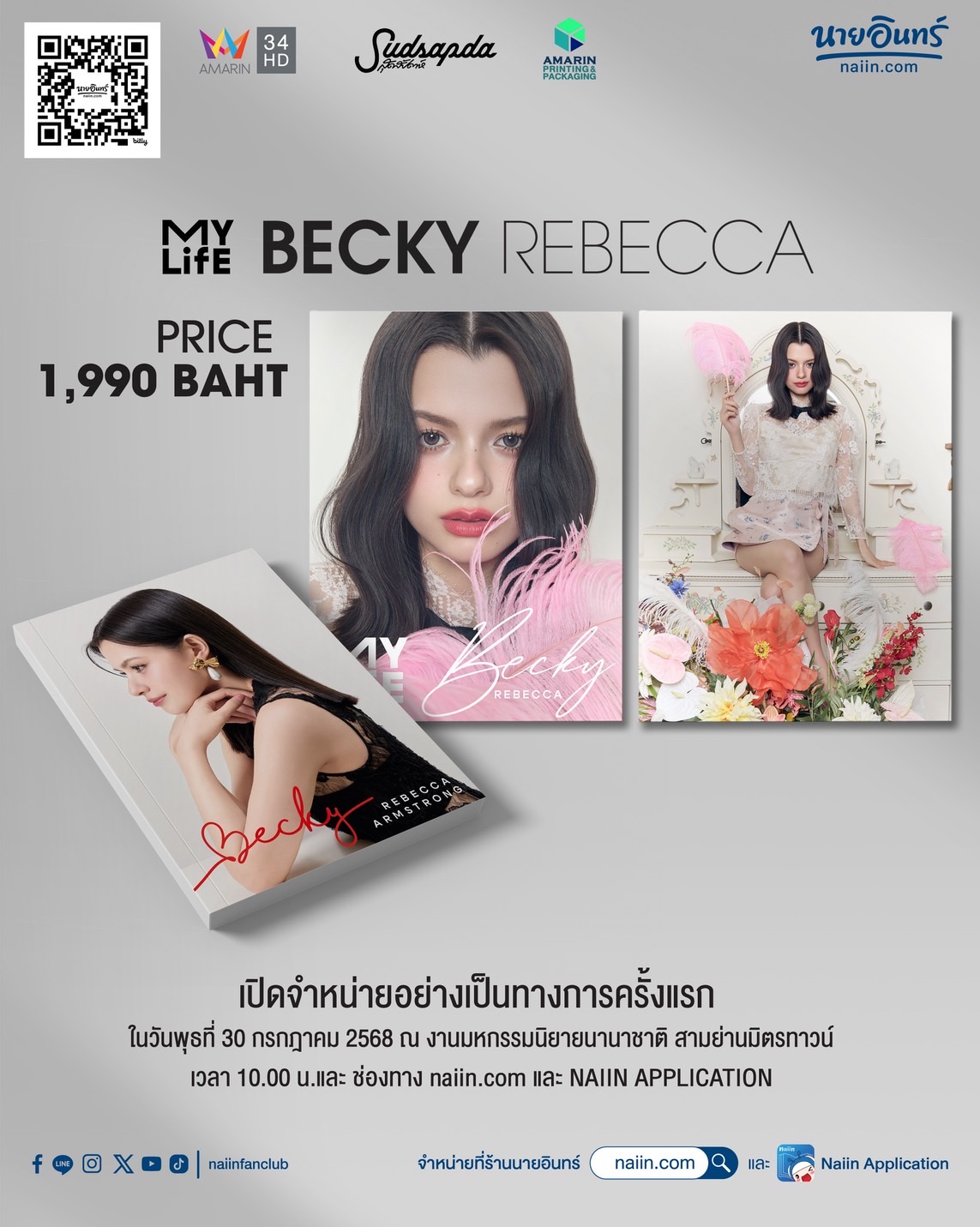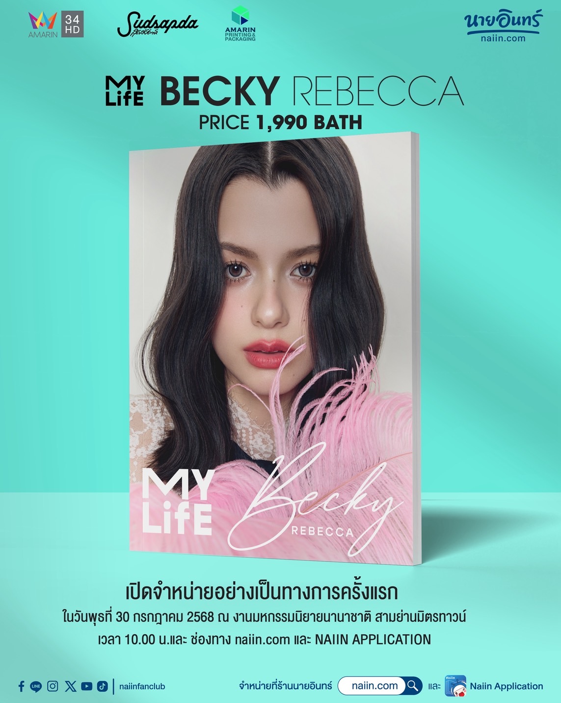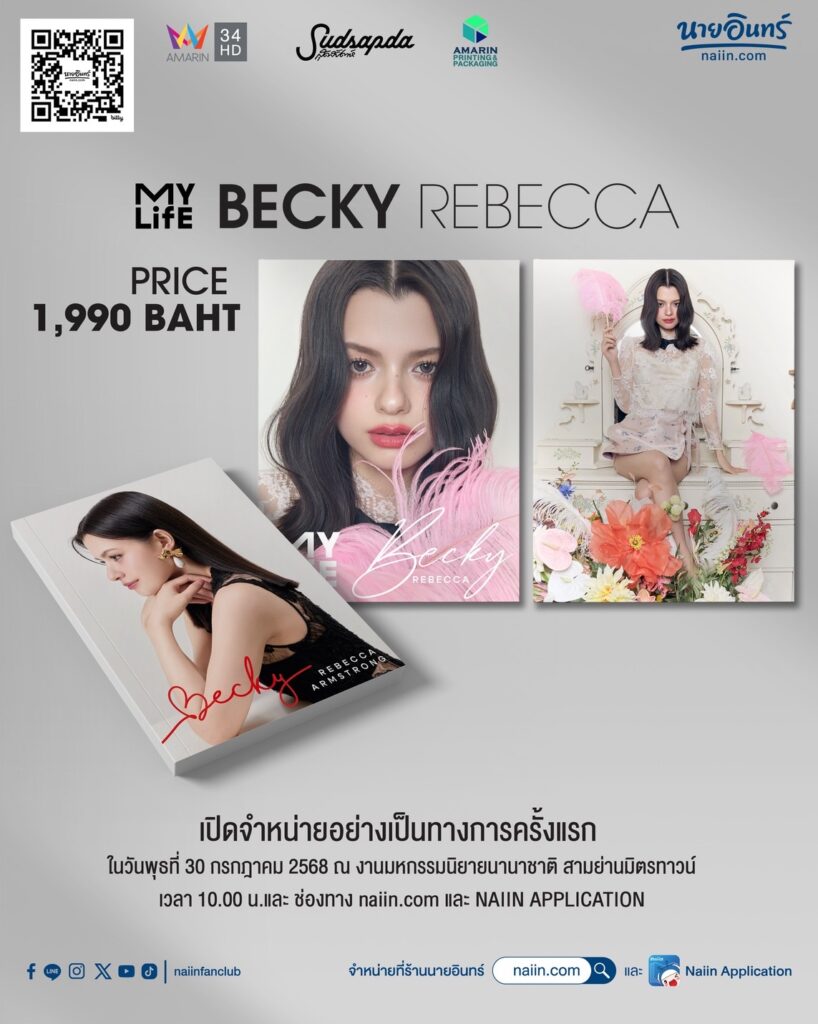 กำหนดการเปิดตัว PHOTOBOOK MY LIFE BECKY REBECCA ในวันพฤหัสบดีที่ 31 กรกฎาคม 2568 สถานที่ งานมหกรรมนิยายนานาชาติ สามย่านมิตรทาวน์ ตั้งแต่เวลา 11.00 – 18.00 น.